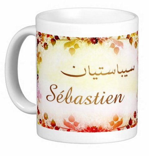 Mug avec le prénom "Sébastien" écrit en français, en arabe (سيباستيان) et calligraphié de façon artistique en arabe sur la partie droite.