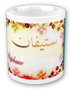 Mug avec le prénom "Stéphane" calligraphié en arabe (ستيفان) ainsi que son épellation lettre par lettre en arabe.