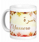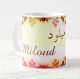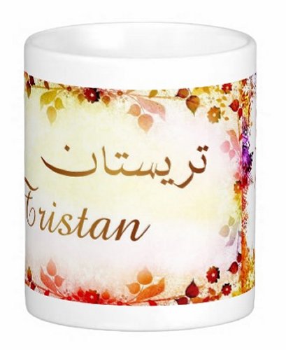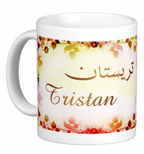 Mug avec le prénom "Tristan" écrit en français, en arabe (تريستان) et calligraphié de façon artistique en arabe sur la partie droite.