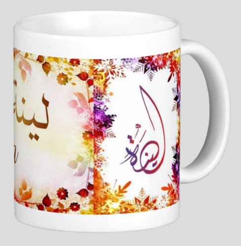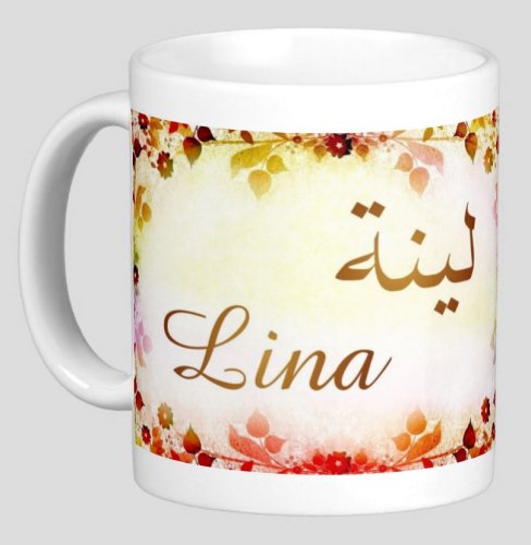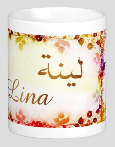 Mug avec le prénom "Lina" écrit en français, en arabe (لينة) et calligraphié de façon artistique en arabe sur la partie droite.