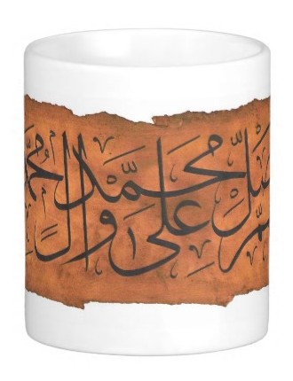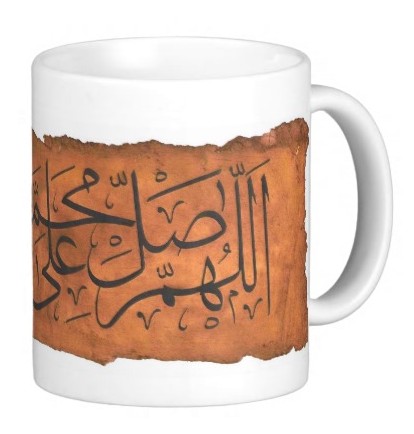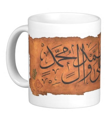 Mug pour décoration avec la calligraphie en langue arabe de la prière sur le Prophète (Paix et Bénédictions sur lui) : "Allâhumma Sallî 'alâ Muhammadin wa 'alâ âli Muhammadin".