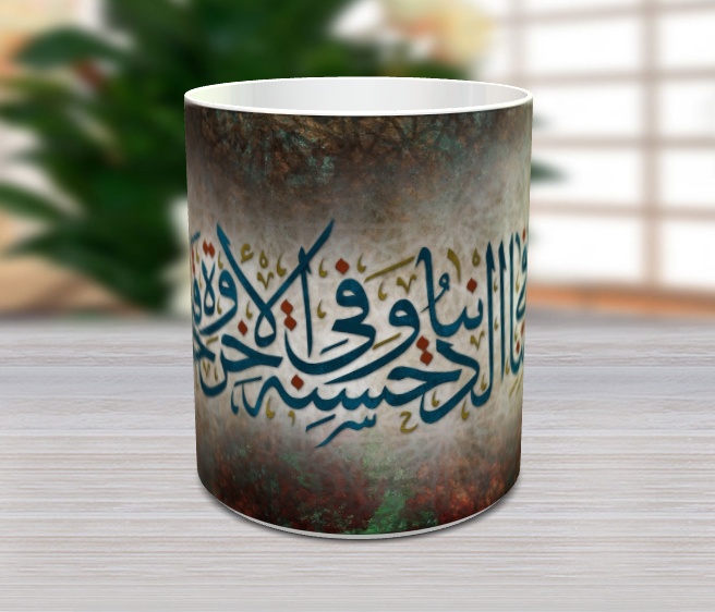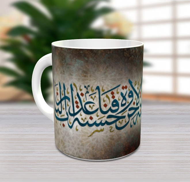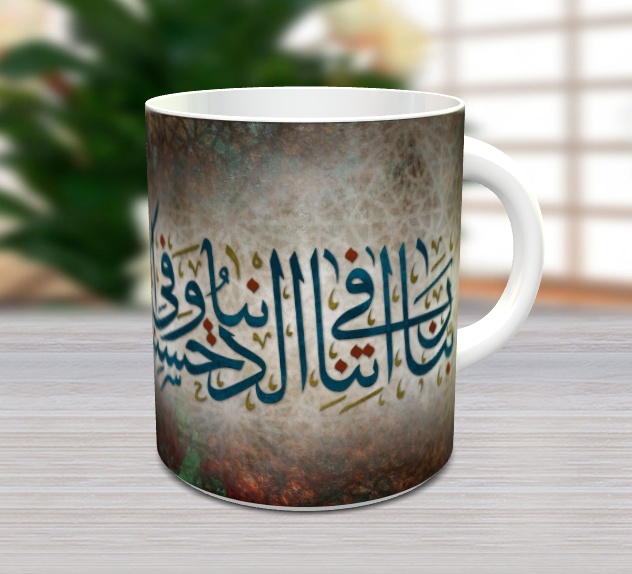 Mug pour décoration avec jolie calligraphie de Sourate Al Baqara - Verset 201 contenant l'invocation coranique suivante : “Notre Seigneur accorde nous une belle part ici-bas, et une belle part aussi dans l’au-delà; et protège-nous du châtiment du Feu”.