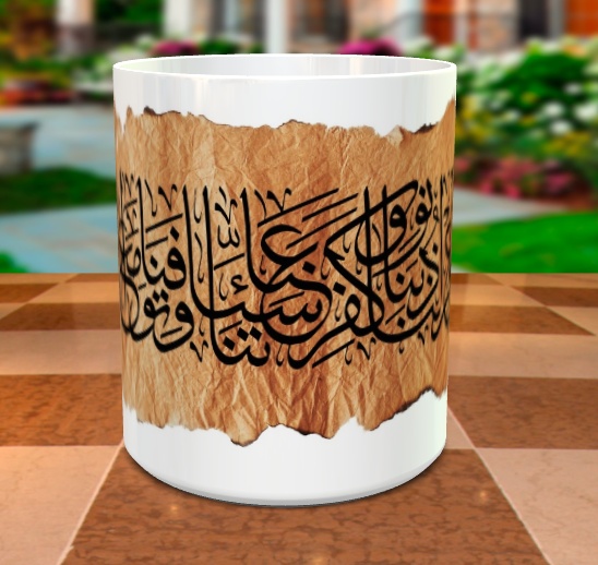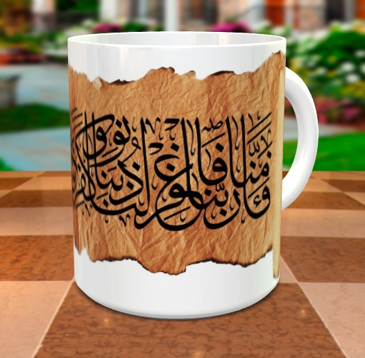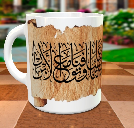 Mug pour décoration avec jolie calligraphie du verset arabe suivant "فَآمَنَّا رَبَّنَا فَاغْفِرْ لَنَا ذُنُوبَنَا وَكَفِّرْ عَنَّا سَيِّئَاتِنَا وَتَوَفَّنَا مَعَ الأبْرَارِ" de Sourate n°3 - Al-Imran Verset 193, voici le verset complet : { Ô mon Seigneur! Nous avons certes entendu l’appel de celui qui appelle ainsi à la foi : "Croyez en votre Seigneur" et dès lors nous avons cru. Ô notre Seigneur, pardonnes-nous nos péchés (et transforme nos péchés en mérites) efface de nous nos méfaits et place nous à notre mort avec les Abrar. }