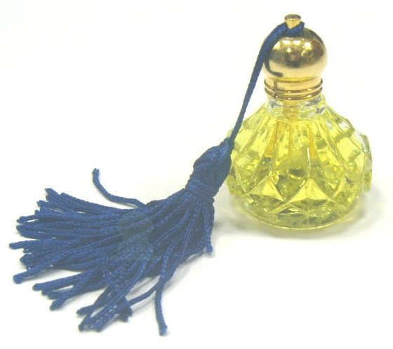 Musc concentré pour femme dans une bouteille en verre et bouchon métallique doré avec pompon.
