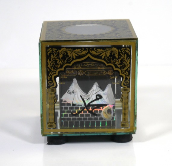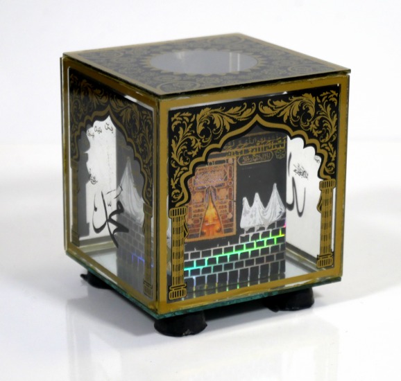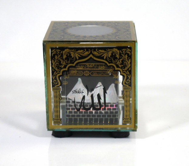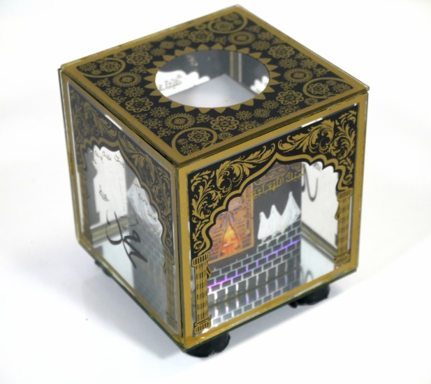 Jolie garniture avec La Kaaba à l'intérieur de vitres en verres et décorations dorées.