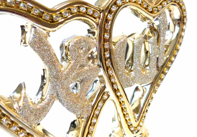 Garniture en porcelaine dorée et avec deux cœurs : le premier cœur contient l’inscription Allah et le second cœur l’inscription Mohamed, tous deux recouverts de poudre argentée et entourés de diamants.