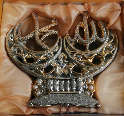 Décoration islamique en porcelaine dorée avec calligraphies Allah et Muhammad (SAW) décoré de jolies émeraudes blanches, présenté dans sa boite cadeau.