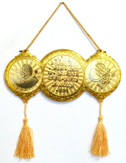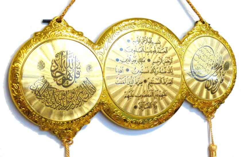 Jolies décoration murale avec trois parties rondes, contenant les Sourate Al-Fatiha, Al-Falaq et Al-Ikhlass calligraphiées.