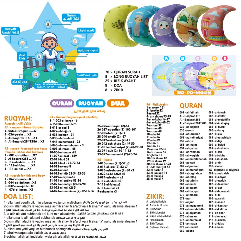 L'enfant pourra s'endormir avec plus de 70 sourates du Coran ainsi que de nombreuses invocations et chants... Vous pouvze choisir parmi 5 roqya différentes en fonction de la situation.
