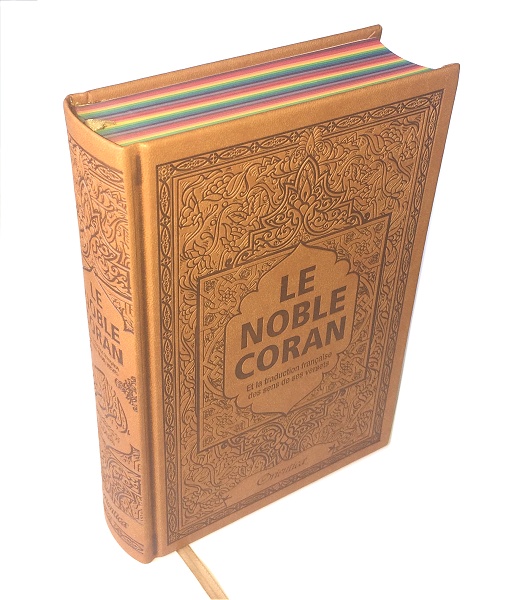 Le Noble Coran avec pages en couleur Arc-en-ciel Rainbow - Bilingue français-arabe - Couverture Cuir de couleur marron dorée - REF. 36148 (25.90 €)
