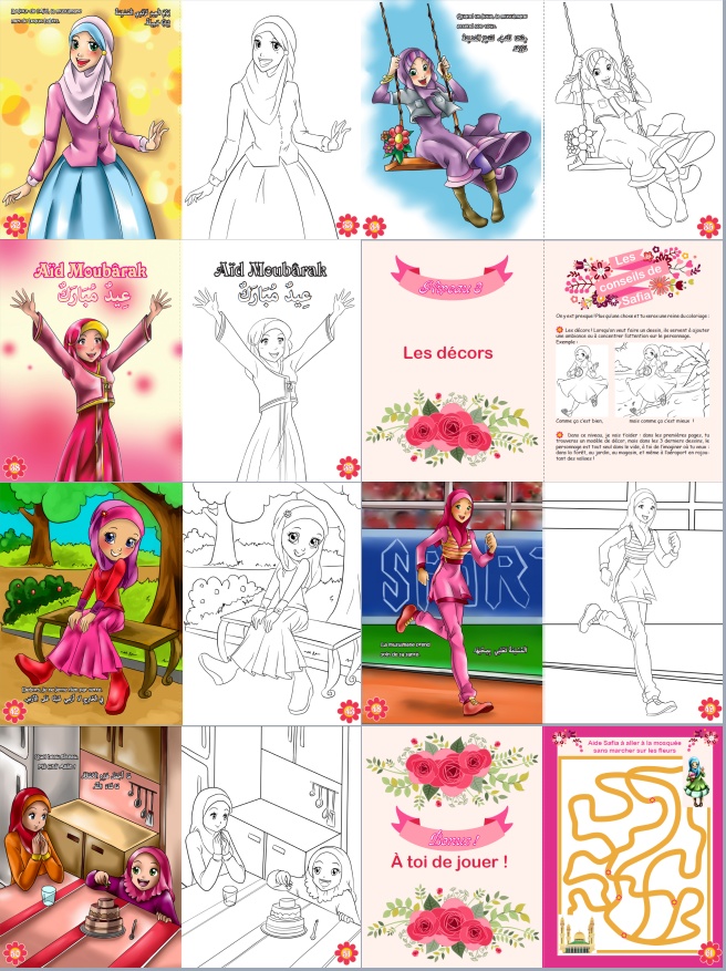 Chaque coloriage permet d’apprendre également sa belle religion grâce à des morales (citées en français et en arabe vocalisé) telles que :