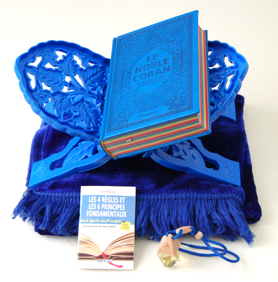 Pack cadeau bleu (mixte) : Le Noble Coran (bilingue français/arabe) + La Citadelle du Musulman + Porte Coran + Tapis de prière en velours + Parfum Musc d'Or Luxe (au choix) - REF. 23269 (39.00 €)