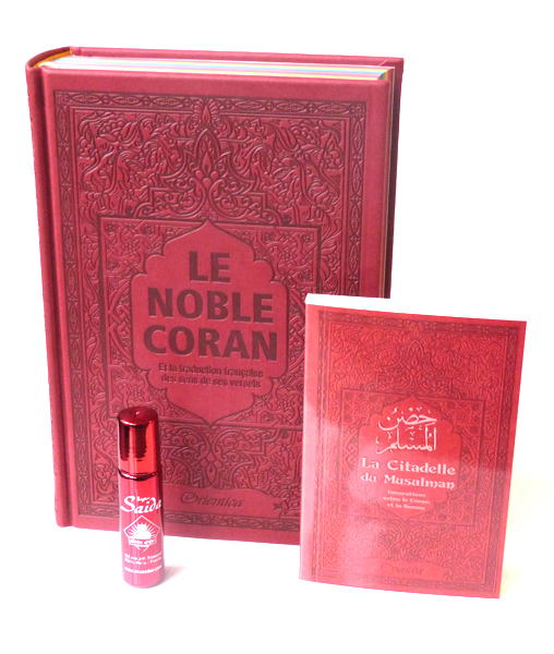 Pack cadeau rose pour femmes : Le Saint Coran & La Citadelle du musulman (français/arabe/phonétique) + Porte Coran + Parfum Musc d'Or Nora - REF. 23601 (36.00 €)
