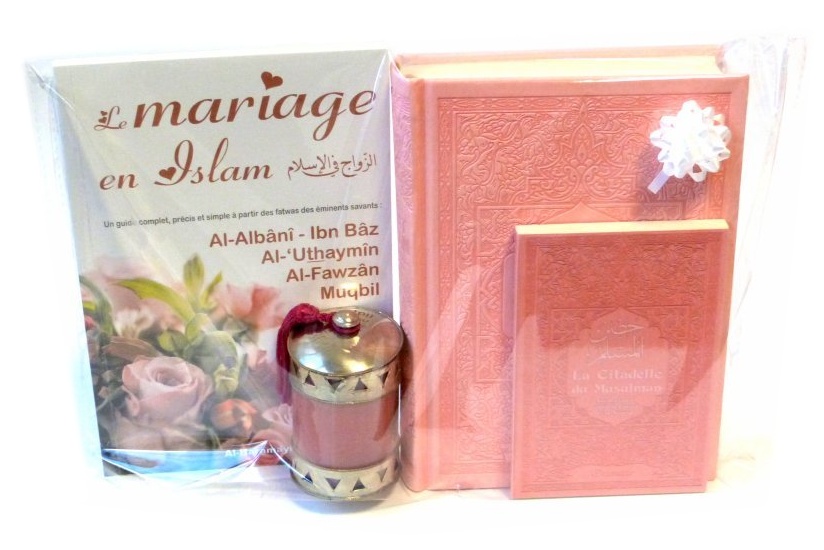 Pack Cadeau Halal rose pour femmes : Livre "Le mariage en Islam" + Le Saint Coran (francais/arabe/phonetique) + La Citadelle du musulman + Bougie