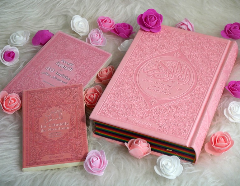 Coffret/Pack Cadeau pas cher de couleur rose pour femme musulmane : Les 40 hadiths an-Nawawî, Chapitre Amma et La Citadelle du Musulman - REF. 28487 (7.50 €)