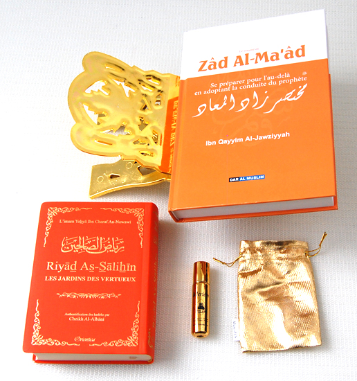 Pack Cadeau Orange : Resume de "Zad Al-ma'ad", "La citadelle du musulman", Porte Coran dore, et parfum avec pochette doree