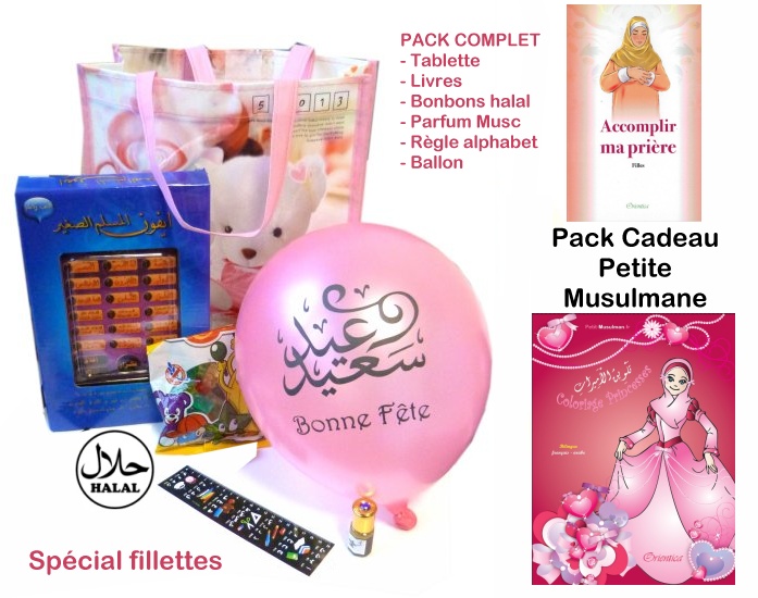 Pack Cadeau Petite Musulmane : Tablette - Livres de prière et de Coloriage - Bonbons Halal - Parfum Musc - Ballon Règle alphabet (Spécial filles/fillettes) - REF. 23798 (19.90 €)