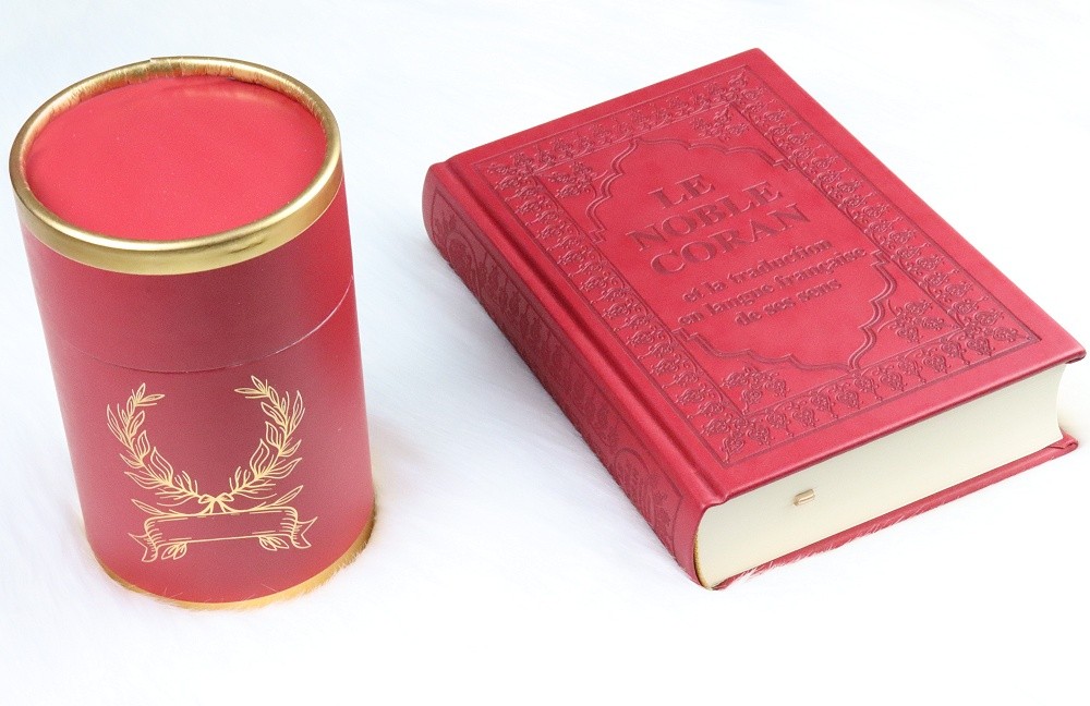 La boite ronde est accompagnée du livre Le Noble Coran et la traduction en langue française de ses sens (bilingue français/arabe) - Edition de luxe couverture cartonnée en cuir rouge bordeaux