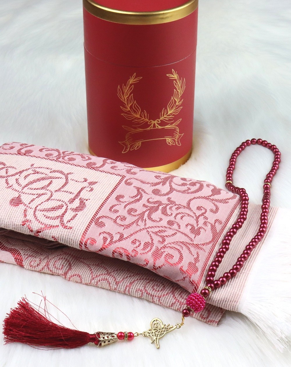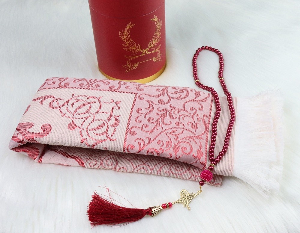 Jolie boite cadeau ronde dorée contenant un tapis brodé (taille adulte) et un chapelet assorti de luxe à 99 perles, avec décorations métalliques.