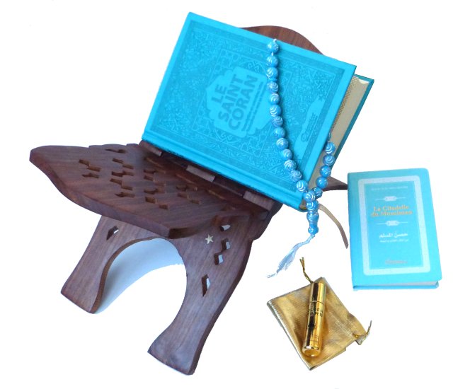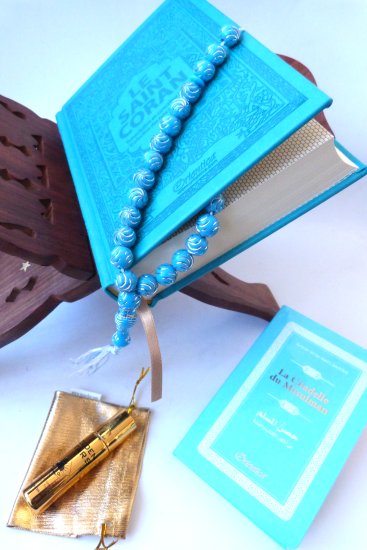 Pack Cadeau de Luxe Couleur Bleu (mixte) : Le Saint Coran et La Citadelle du musulman (français-arabe-phonétique) + Porte Coran en bois + Chapelet + Parfum au choix Divers Coup de coeur
