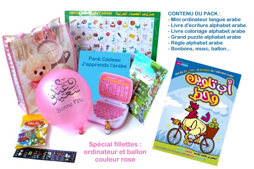 Pack Cadeau fillettes de 3 ans et plus : J'apprends l'alphabet arabe (Mini ordinateur - Puzzle - Livre - Règle - Bonbons Halal) - REF. 23802 (19.90 €)