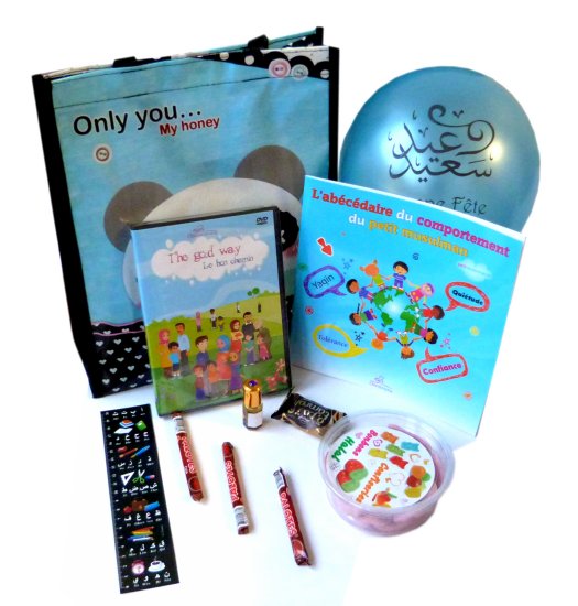 Le Mega Pack Cadeau : Sac surprise "J'apprends ma religion" (Ordinateur, Bonbons halal, Livres, DVD, Musc...) pour enfant, école arabe, etc. - REF. 15388 (28.00 €) - En Promotion à 19.95 €