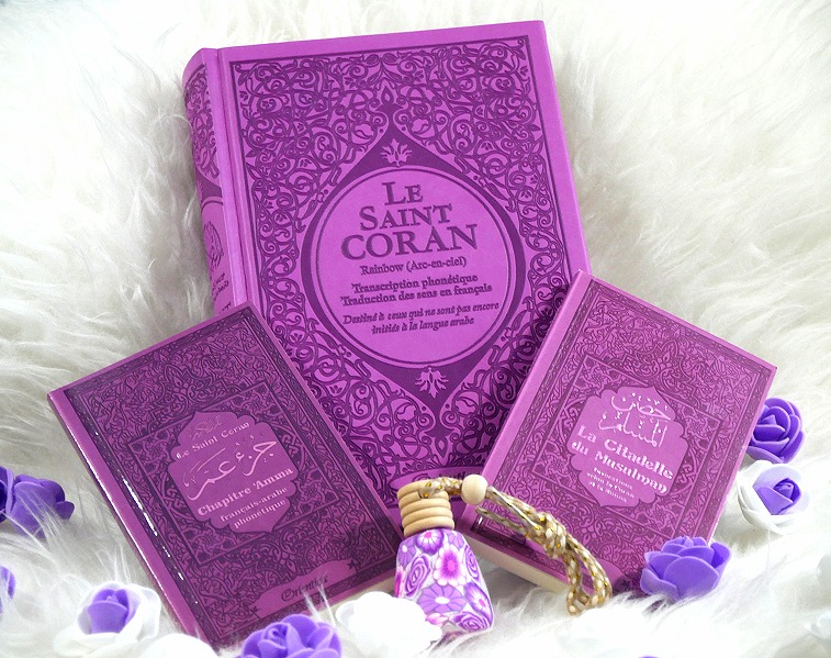 Pack Cadeau pour femme musulmane couleur mauve assorti avec : Le Saint Coran Rainbow - Chapitre Amma - La Citadelle du Musulman - Diffuseur de parfum Deco & Cadeau Coup de coeur
