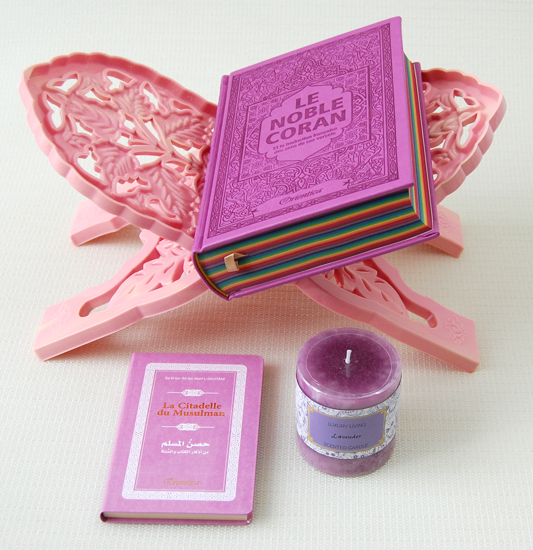 Pack Cadeau Halal rose pour femmes : Livre "Le mariage en Islam" + Le Saint Coran (français/arabe/phonétique) + La Citadelle du musulman + Bougie - REF. 24056 (39.90 €)