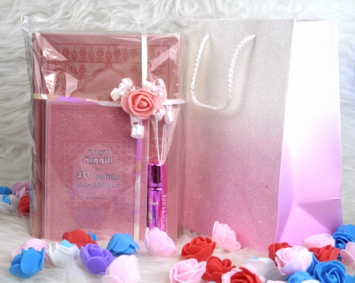 Pack Cadeau pour femmes couleur rose clair (Le Coran et Les 40 hadiths an-Nawawi bilingues - Parfum luxe - Sac cadeau)