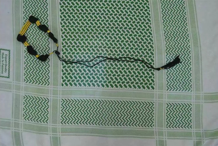 Ce pack contient deux pièces : un foulard carré (ghutra) et un 'Agal noir doré.