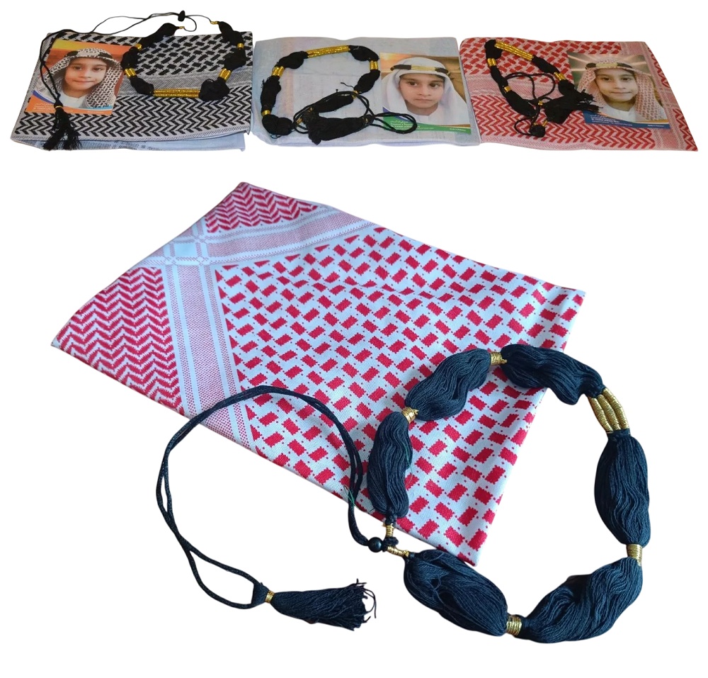 Foulard avec son Agal (noir doré qu'on pose sur la tête), voir photo. Taille standard pour enfant.