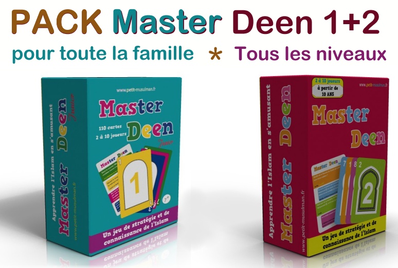 Master Deen est jeu de stratégie et de connaissance de l'Islam. Il contient 110 cartes avec 120 questions : sur le Coran, les Prophètes, le Prophète Mohamed (PBSL), les piliers de l'islam et des questions d'ordre générales sur l'Islam.