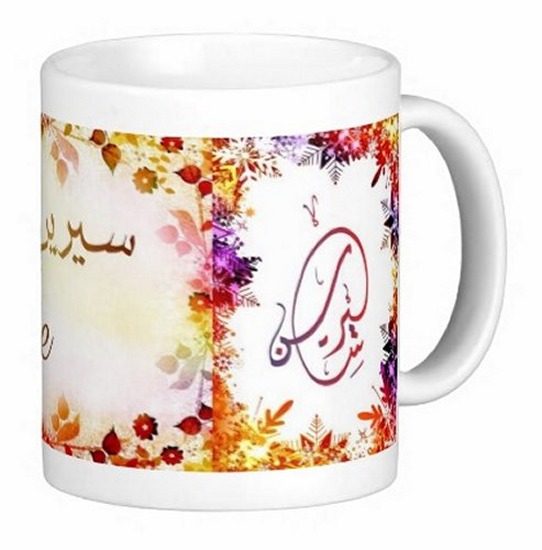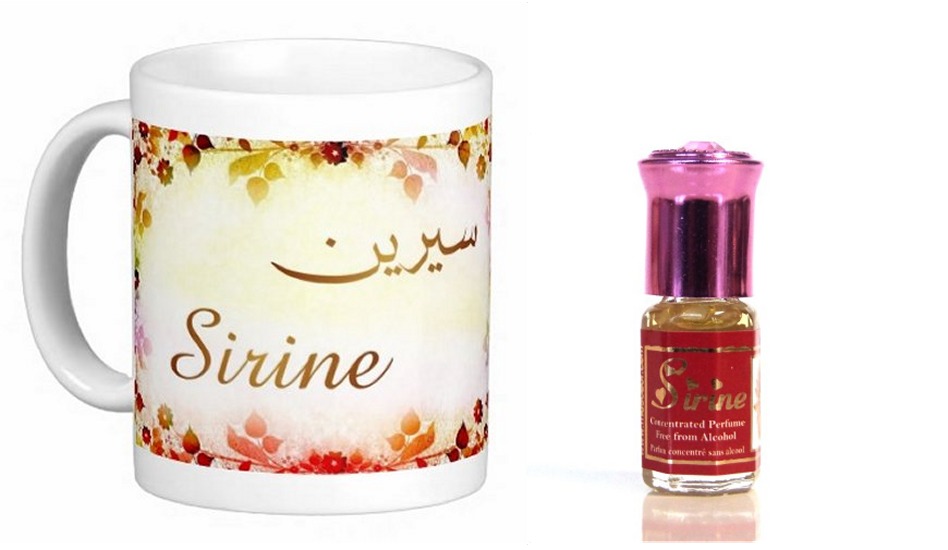 Pack constitué du Parfum (3 ml) "Sirine" et du Mug avec le prénom "Sirine" écrit en français, en arabe (سيرين) et calligraphié de façon artistique en arabe sur la partie droite.