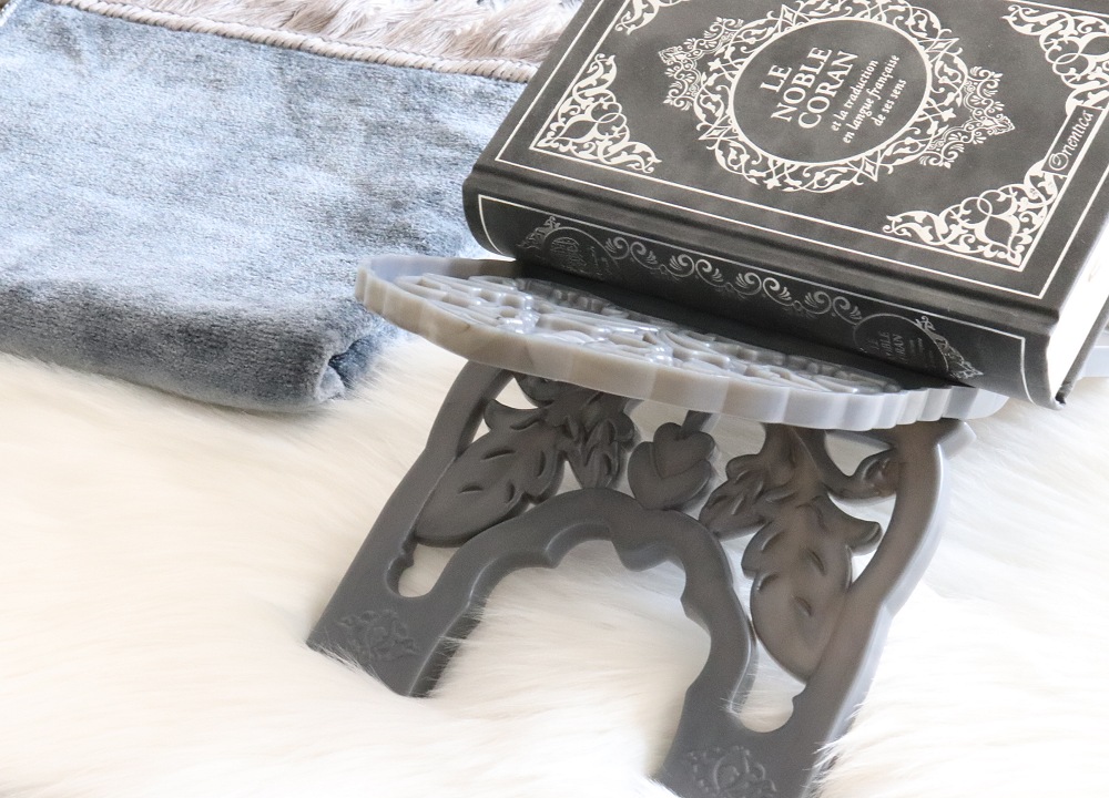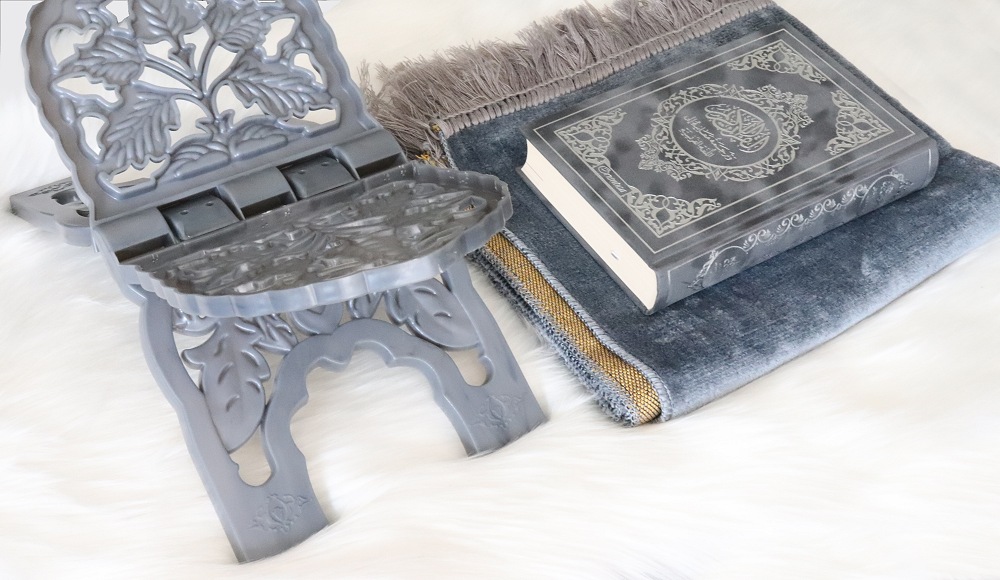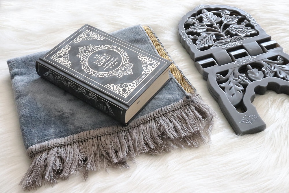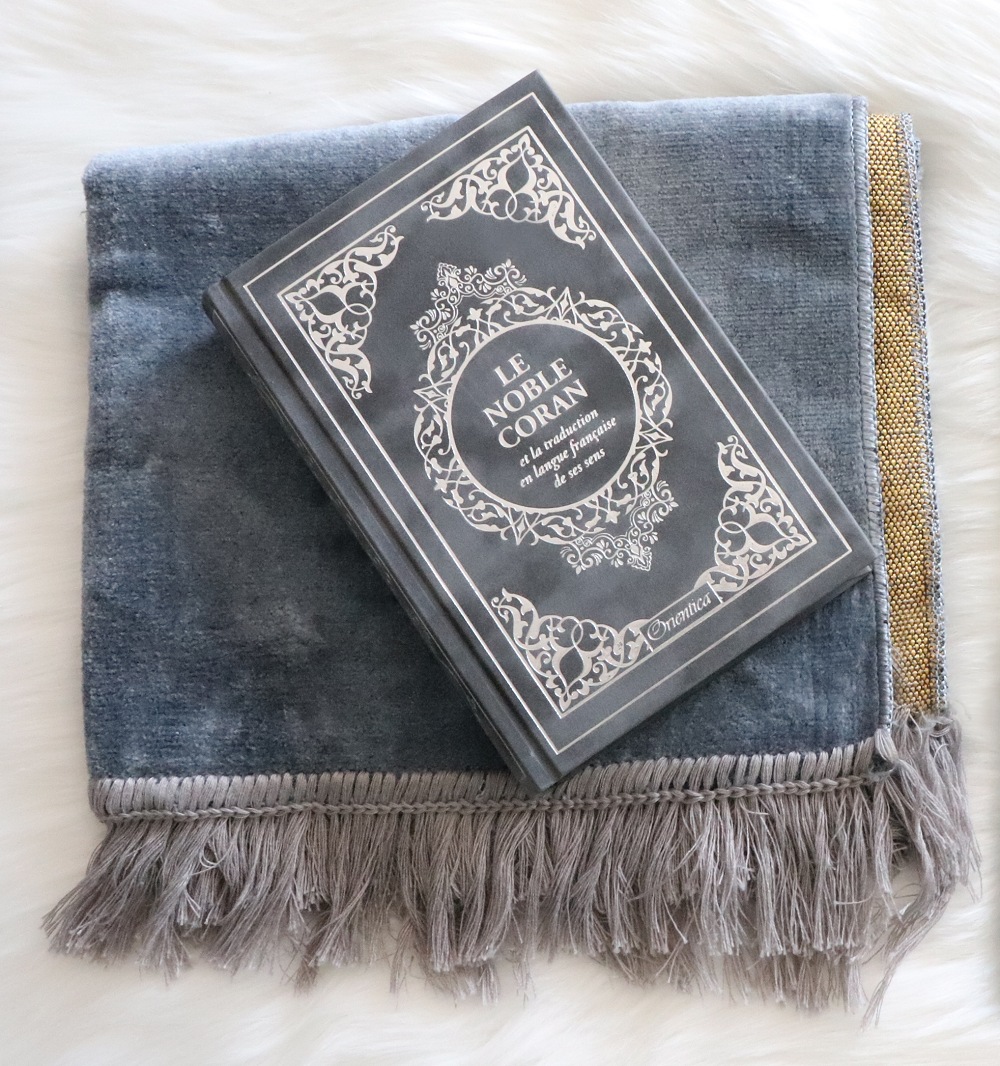 Pack cadeau Gris : Le Noble Coran bilingue français/arabe (édition de luxe en daim argenté) + Tapis en velours couleur unie assortie (Coffret Muslim pour homme) - REF. 40339 (32.00 €)