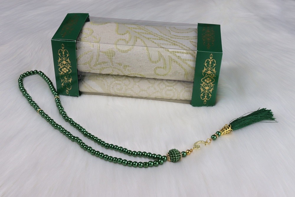 Coffret Cadeau Musulman doré : Tapis décoré brillant et Chapelet (Sebha) - Couleur Vert - REF. 35569 (16.90 €)