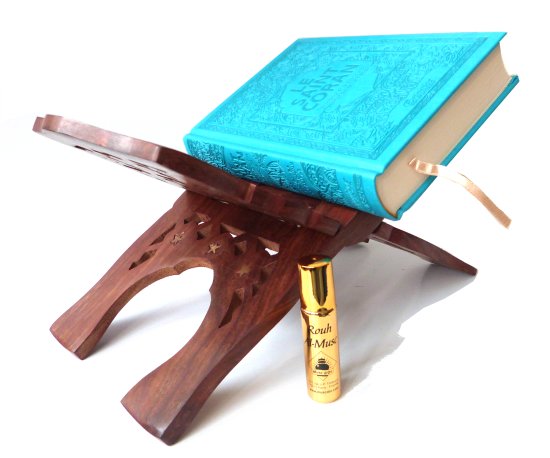 Pack cadeau pour femmes constitué d'un joli porte Coran en bois sculpté et décoré + Parfum Musc d'Or de luxe (8 ml) + Coran arabe couverture cuir de luxe bleu-turquoise - REF. 23001 (28.00 €) |