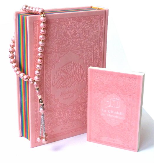 Pack cadeau coranique Rose : Le Saint Coran Rainbow Bilingue (aux couleurs Arc-en-ciel) + La Citadelle du Musulman (francais/arabe/phonetique) + Chapelet
