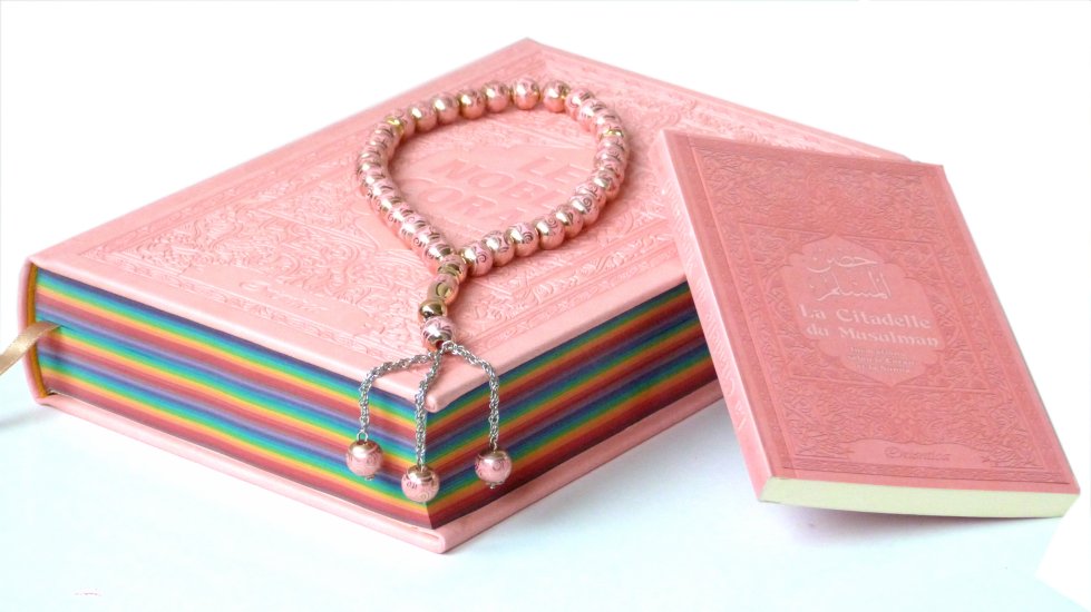 Pack cadeau coranique Rose : Le Saint Coran Rainbow Bilingue (aux couleurs Arc-en-ciel) + La Citadelle du Musulman (français/arabe/phonétique) + Chapelet Livre Coup de coeur