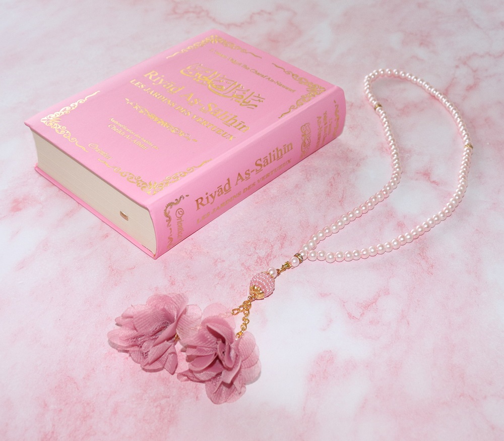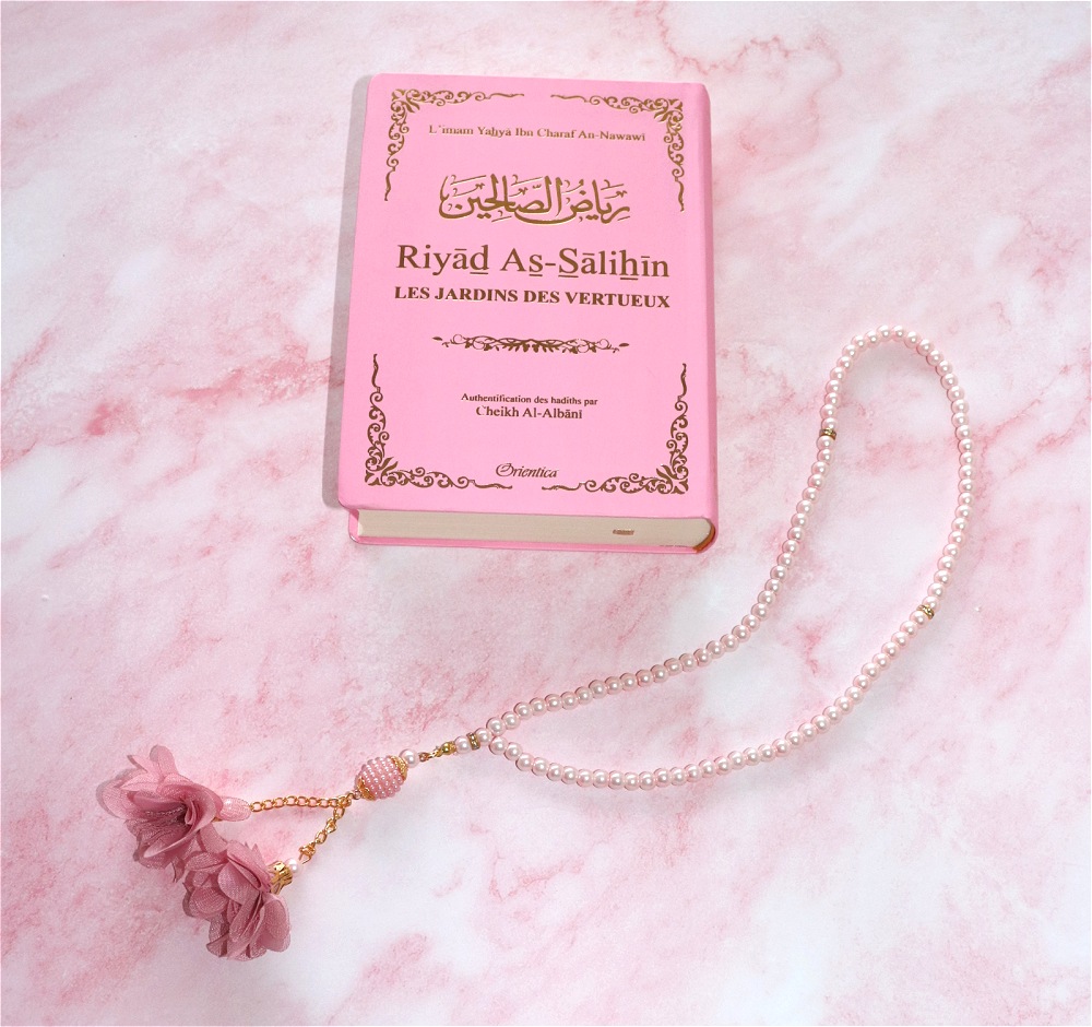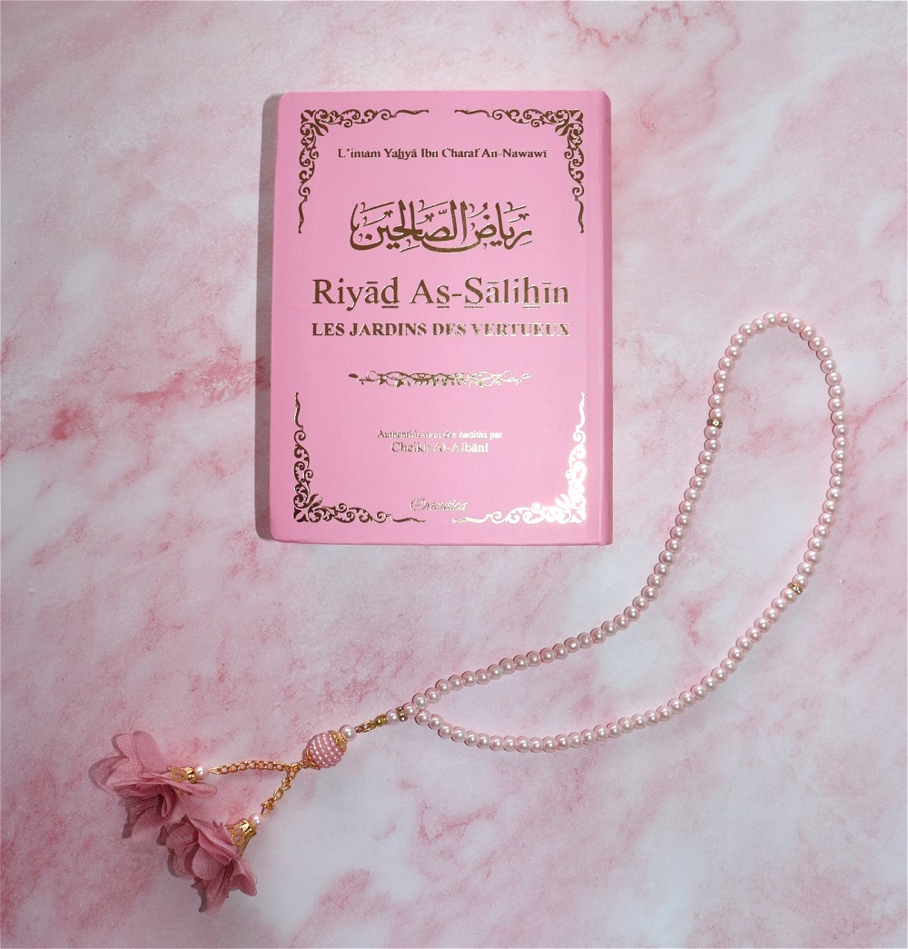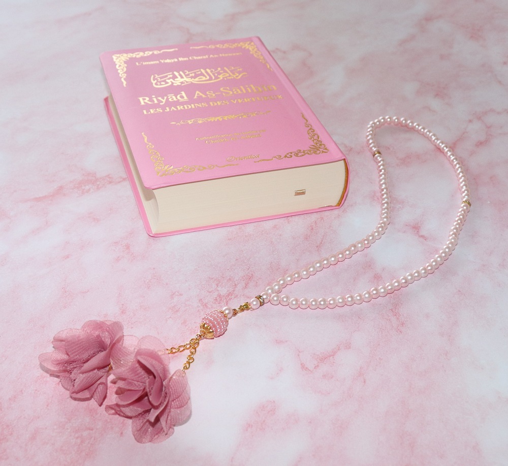 Recevez ce joli pack cadeau avec une Sebha rose (peut varier légèrement en fonction des lots disponibles) et d'un maghifique livre "Riad As-Salihine" rose doré assorti.