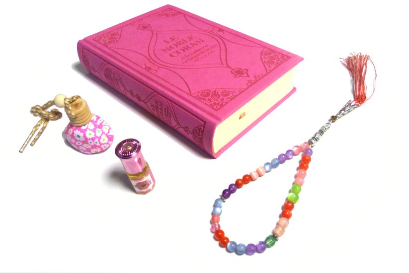 Coffret/Pack cadeau prière pour femme : Tapis rose, Coran luxe rose, Porte Coran, Diffuseur de parfums, parfum Musc d'Or et chapelet perles - REF. 21951 (45.00 €) |