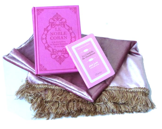 Pack Cadeau Mauve : Le Noble Coran avec couleurs Arc-en-ciel (Rainbow), La Citadelle du Musulman, Le Prophète Muhammad (SAW) et la femme, Tapis uni en velours, Diffuseur de parfum (assortis) - REF. 24134 (39.90 €) - En Promotion à 35.00 €
