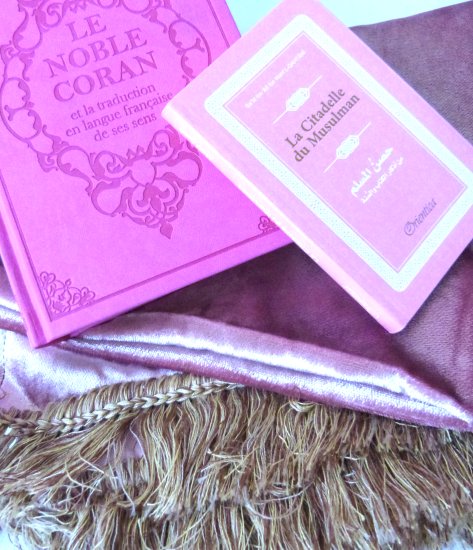 Pack cadeau : Le Noble Coran (bilingue français/arabe) mauve + La Citadelle Du Musulman mauve assortie + tapis de priere en velours - REF. 23256 (40.00 €)