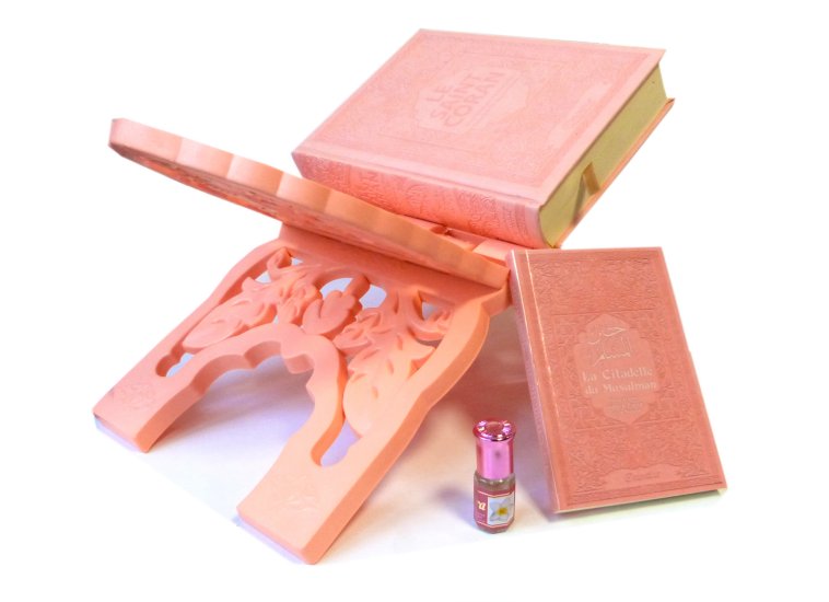 Pack Cadeau femme constitué d'un Coran couverture cuir de luxe (rose) + Joli Porte-Coran en bois sculpté et décoré + Parfum Musc d'Or de luxe (8 ml) - REF. 22929 (35.00 €)