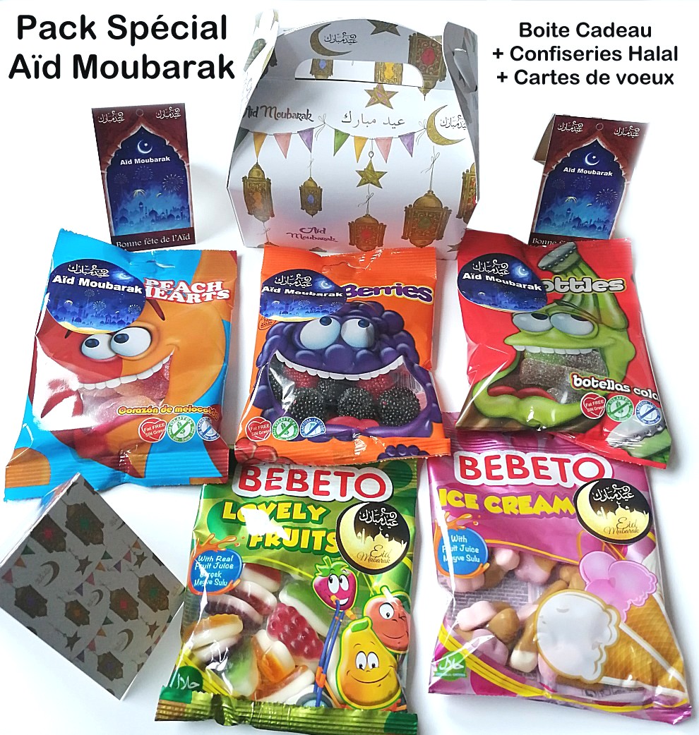 Pack constitué d'une Boite cadeau Aïd Moubarak, de 2 Cartes de vœux à l'intérieur desquelles ont peut inscrire des messages et de 5 sachets de bonbons confiseries halal estampillées Aïd Moubarak (5 x ~100g).
