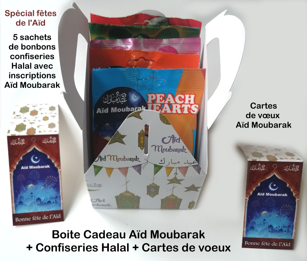 Pack special Aid Moubarak Boite cadeau + Melange de 5 sachets de bonbons "Eid Mubarak" et Cartes de voeux Eid Mubarak