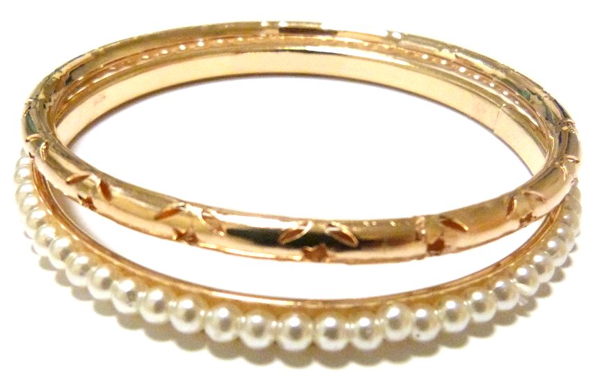 Ensemble constitué de 2 bracelet en métal doré garni d'une bande de perles ovales de couleur blanche 1 étoilé.