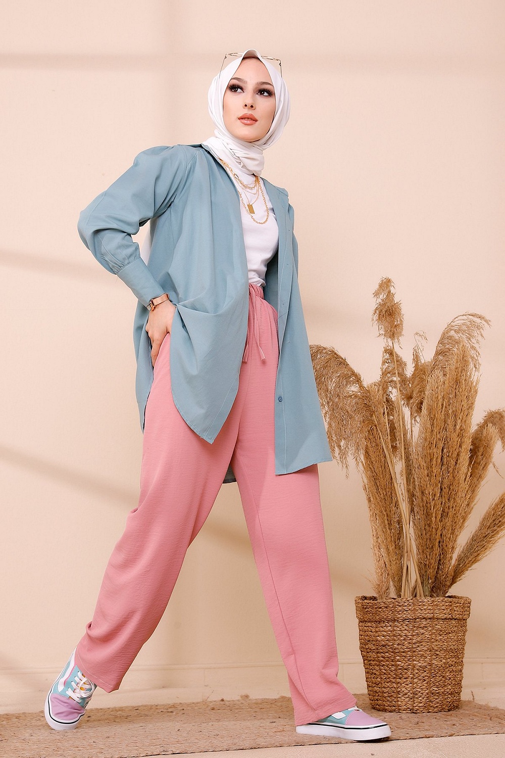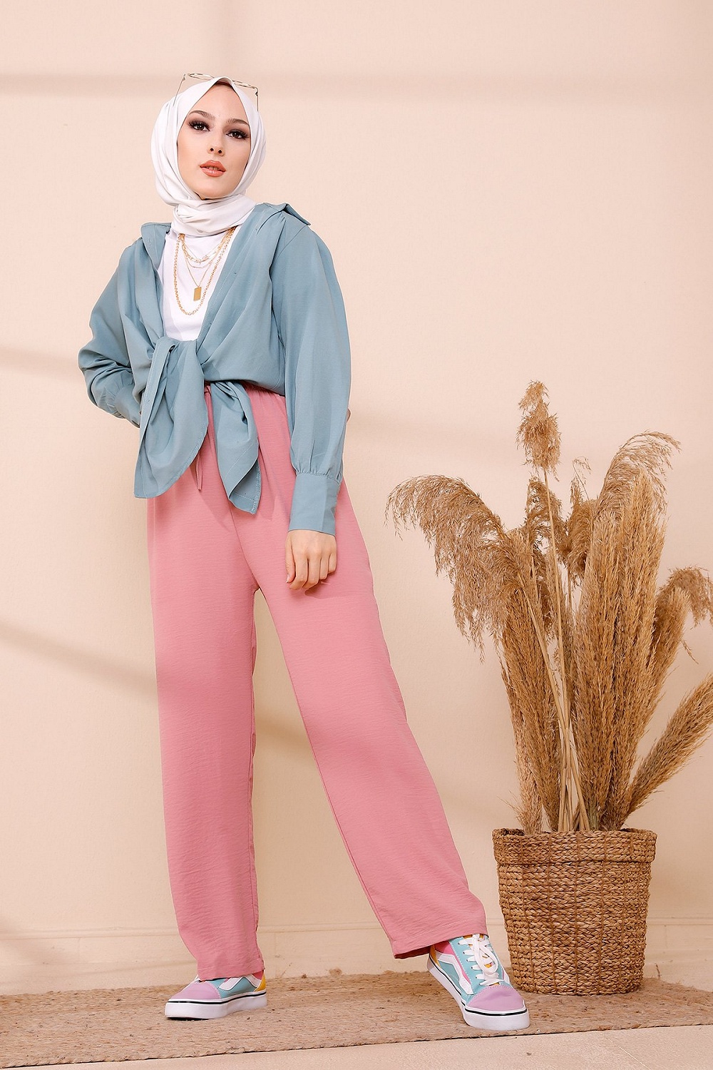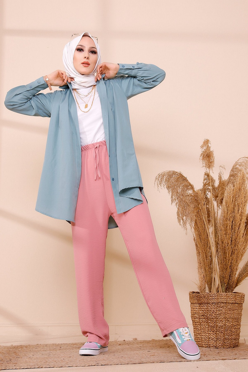 Ensemble Pantalon Palazzo ample et Blouse avec collier assorti (Tenue femme musulmane en ligne) - Couleur crème et kaki - REF. 32871 (19.90 €)