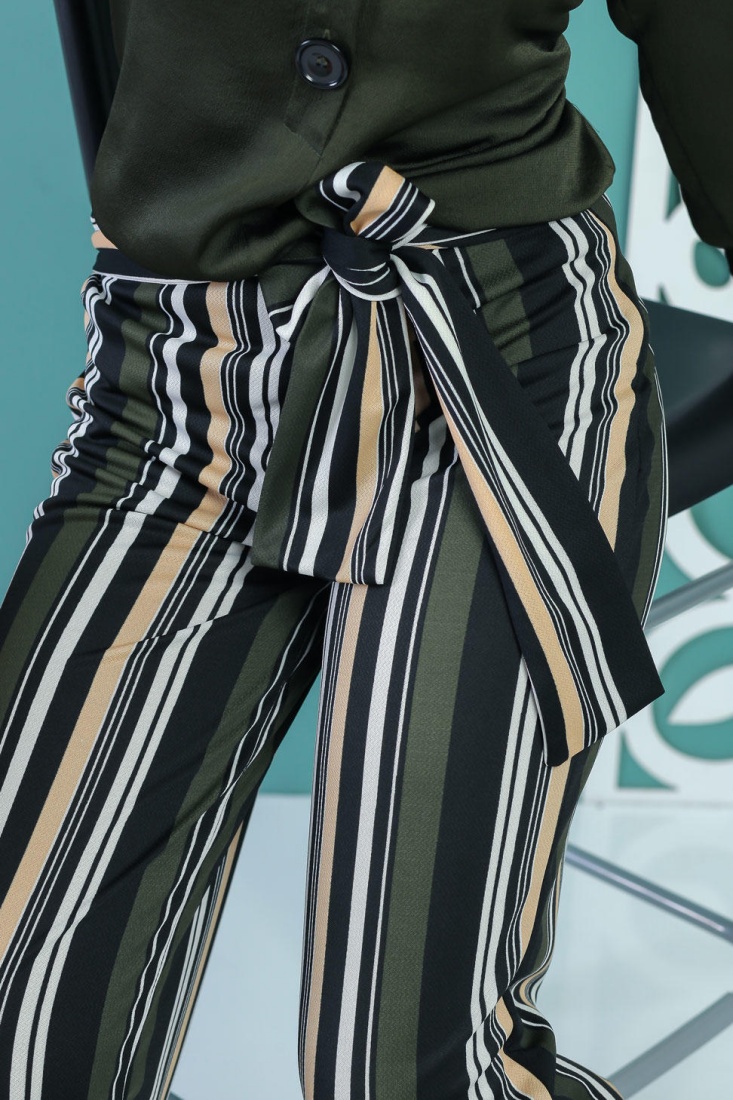 Pantalon femme a rayures blanches, noires, beiges et kakis (ceinture a motif)