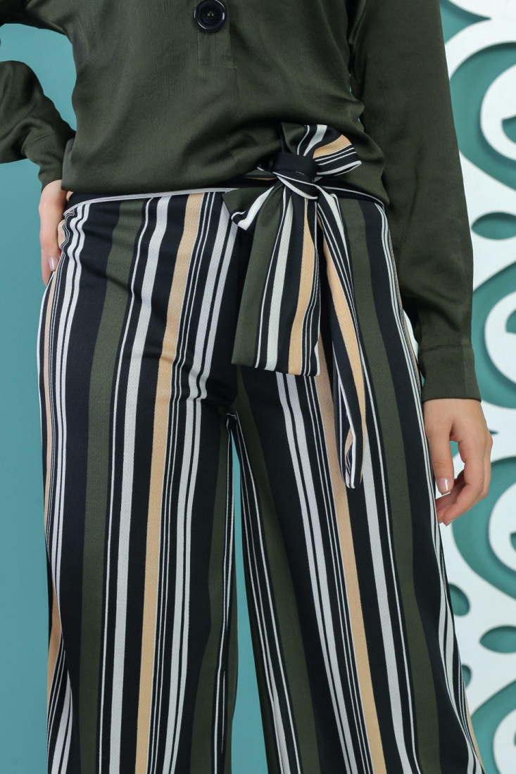 Pantalon femme à rayures blanches, noires, beiges et kakis (ceinture à motif) Vetement & Accessoire