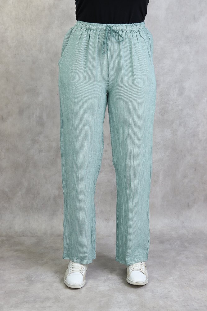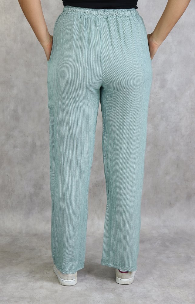 Pantalon femme décontracté en lin blanc à fines rayures vert amande Vetement & Accessoire